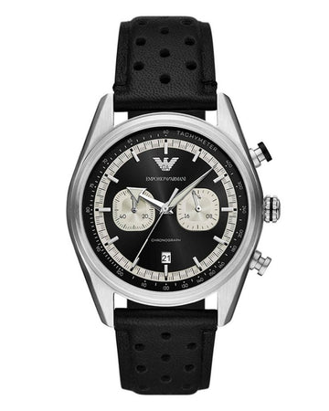 Emporio Armani's 42mm watch features a black sunray dial with cream cd finished subeyes, chronograph...