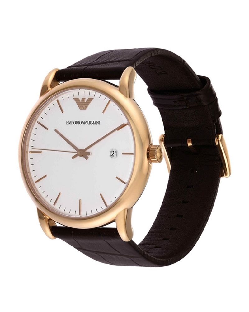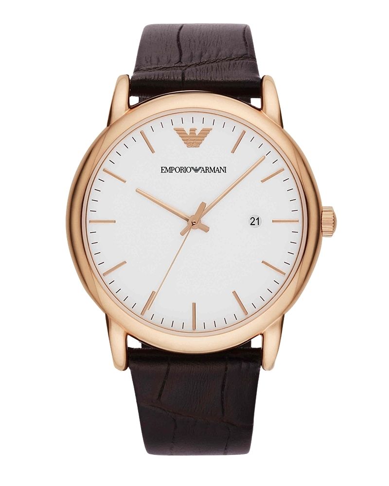 This contemporary Emporio Armani rose gold-tone watch features a minimalist matte white dial, date window and croco-embossed brown leather strap.
