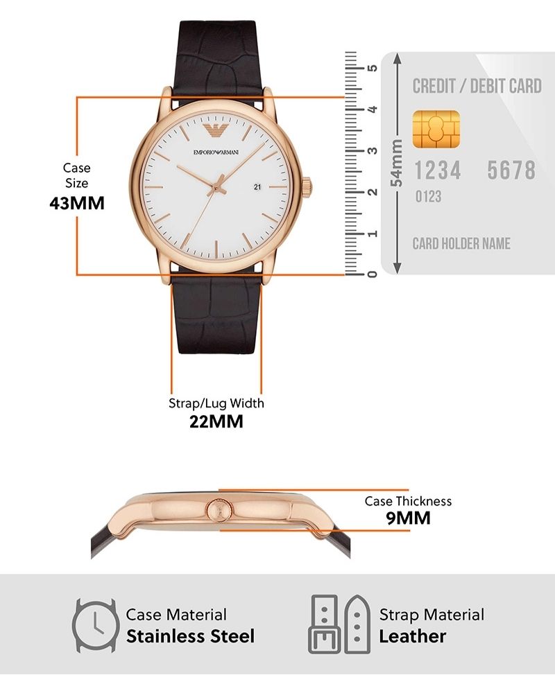 • Dark brown plated leather strap with strap buckle closure; interchangeable with Emporio Armani 22mm watch straps