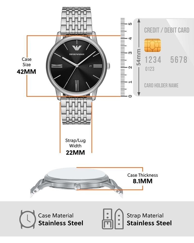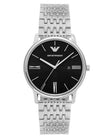 Emporio Armani's 42mm watch features a black sunray dial, three-hand date movement and stainless steel bracelet.