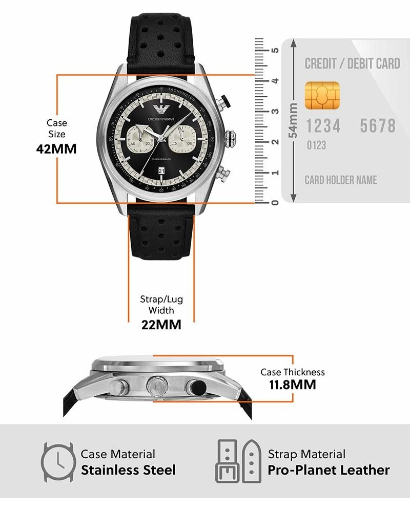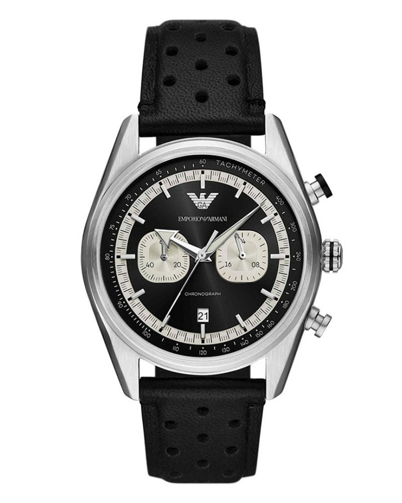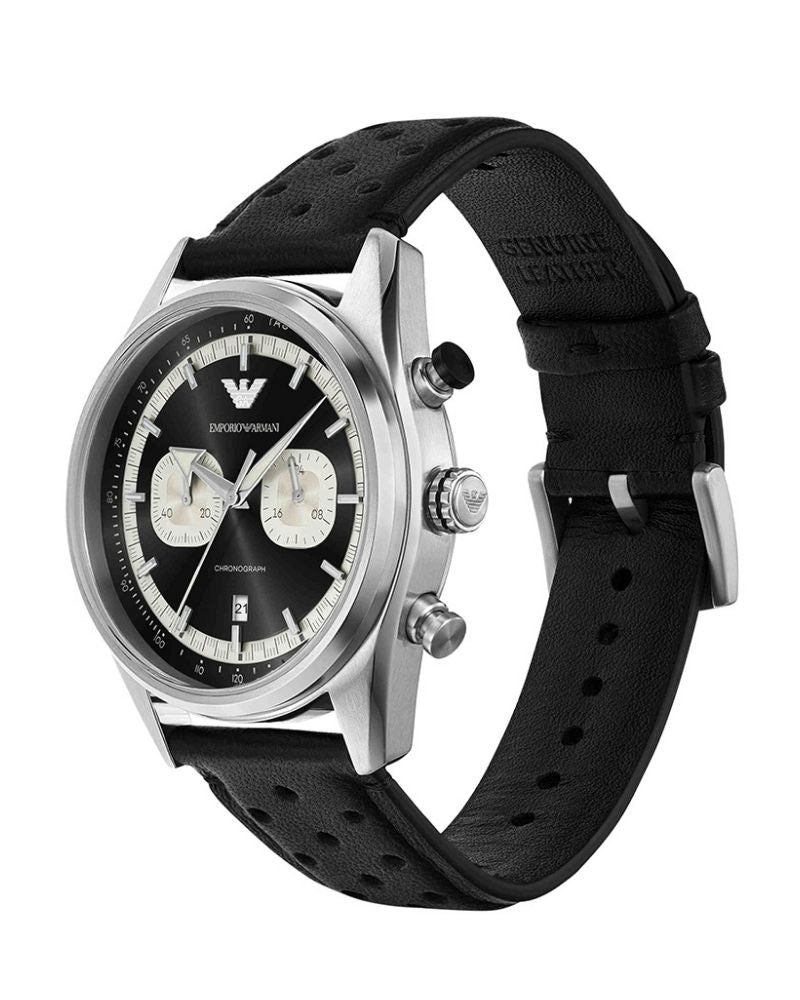 Emporio Armani's 42mm watch features a black sunray dial with cream cd finished subeyes, chronograph movement and perforated black leather strap.