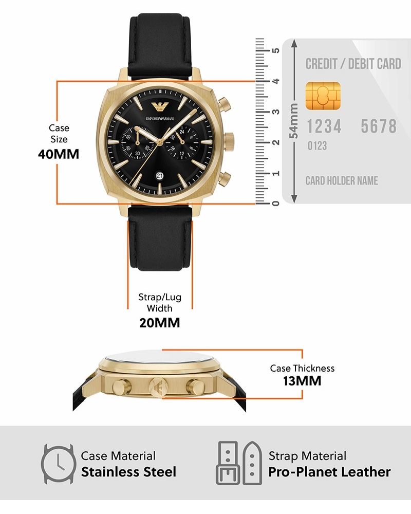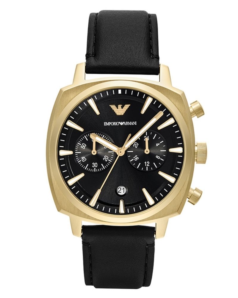 A 40mm, cushion-shaped case frames the black sunray dial of this Emporio Armani watch with a quartz chronograph movement. Complemented by a pale gold tone stainless steel case with a date window at 6 o'clock and a black leather strap, this watch is the perfect contemporary execution of vintage flair.
