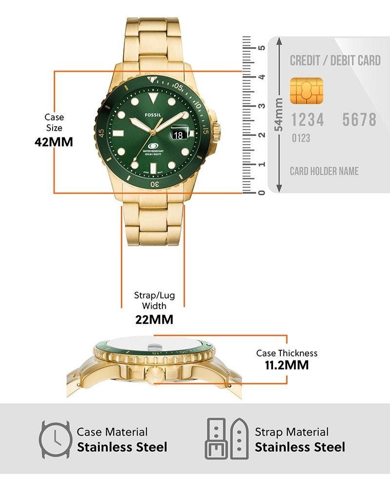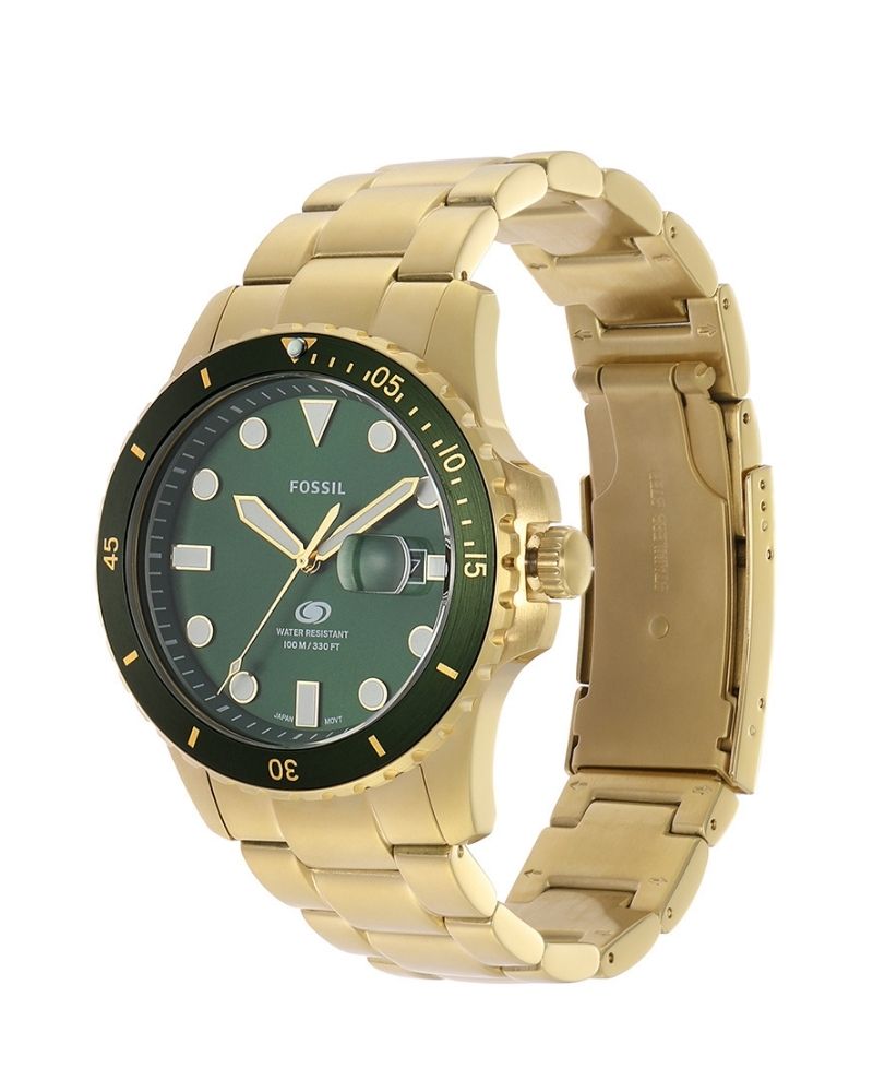 Purposeful design details define our time-honored watch collection, Fossil Blue Dive. This gold-tone dive-style timepiece is expertly crafted with a 3-link stainless steel bracelet, geometric indices and a unidirectional rotating topring. Tested to 100 meters of water resistance. *Not ISO certified.