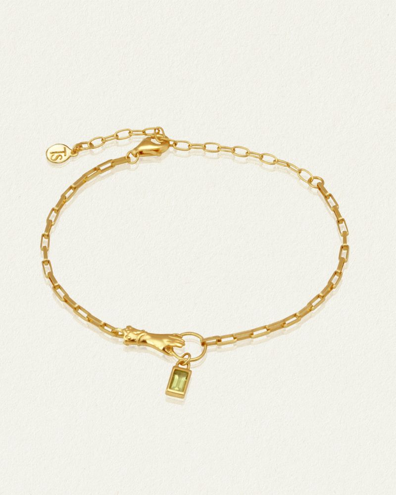 The Alexa Bracelet in 18K Gold Vermeil is a long box chain featuring a Victorian inspired hand motif, grasping a golden ring on which a baguette cut peridot charm hangs. Translating to 'protector of mankind' from Greek, the Alexa's hand symbolises loyalty and strength as it uplifts a Peridot stone, understood to radiate warmth, positivity, and creativity.