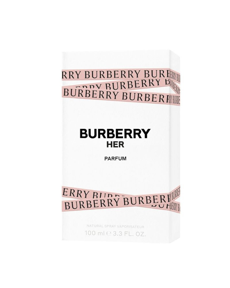 Burberry Her Parfum opens with delicate cherry notes. This fruity yet profound gourmand fragrance then evolves through warm amber to an elegant and enveloping vanilla – complex and full of contrasts. Burberry Her Parfum is the most intense fragrance in the family – daring and sophisticated. Burberry Her is the essence of freedom: the thrill of open skies, the joy of self-expression, the empowerment of following your own path. A bold scent that becomes the signature of the woman wearing it. The iconic Burberry Her bottle is presented in an opaque deep pink color with a fully matte finish, representing the intensity and boldness of the fragrance. The packaging is adorned with more ribbons, also picking up this tone of pink and relaying the scent's intensity.
