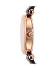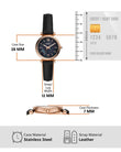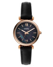 This 28mm Carlie Mini features a black mother-of-pearl dial with Roman numeral and stick indices, three-hand movement and a black leather strap.