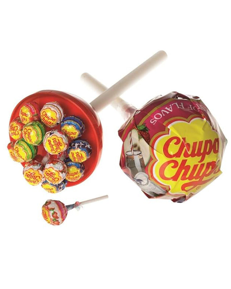 Chupa Chups is the world's most famous lollipop. This Chupa Chups Megachup contains 15 assorted flavour lollipops (Strawberry, Orange, Apple, Cherry, Watermelon and Lemon).