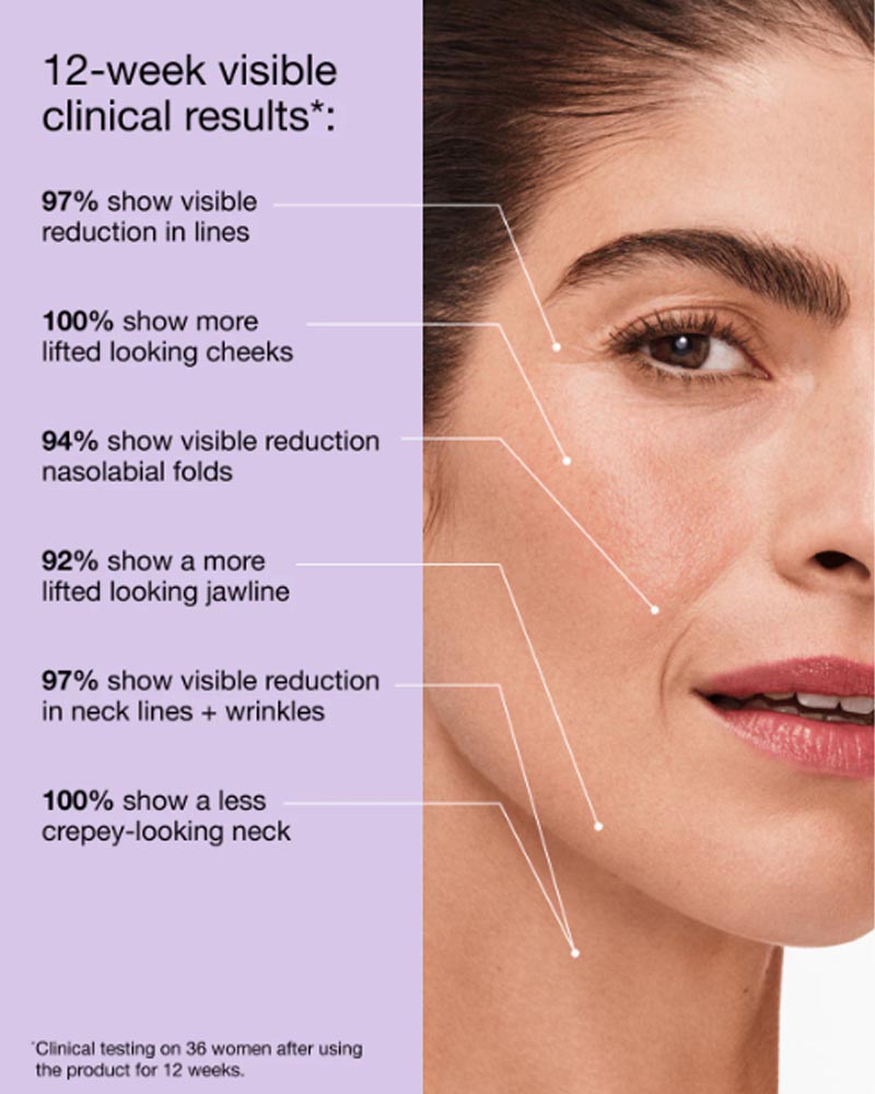 Powerful face and neck cream visibly lifts and reduces the look of lines and wrinkles. 100% show a more lifted-looking face and neck.*