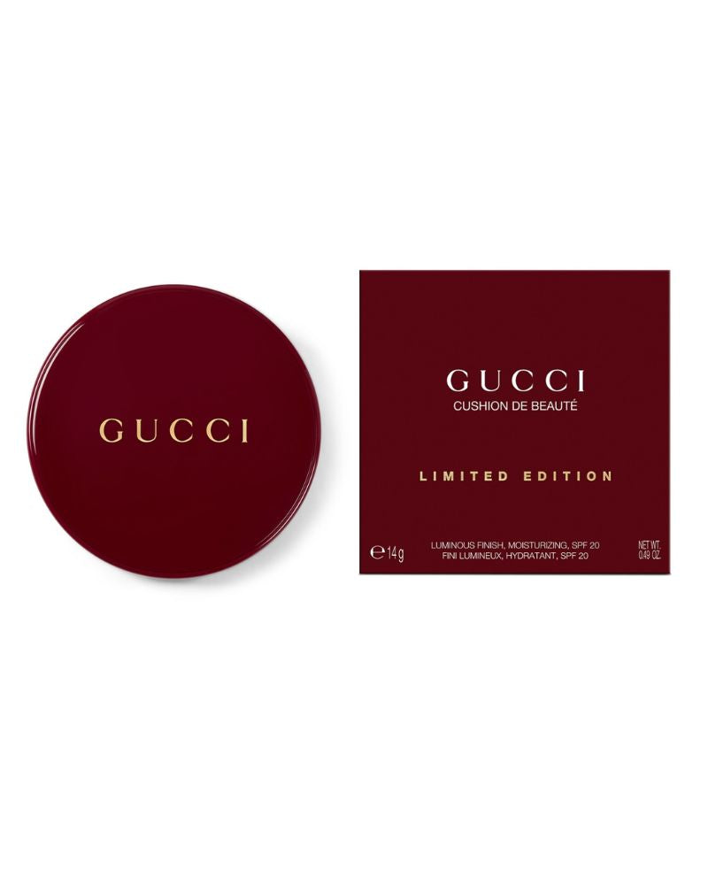 Celebrate the unexpected wonder of the holiday season with Gucci Beauty Cushion de Beauté, the 24-hour hydrating glow cushion foundation with SPF 20 PA++ now in a collectable, refillable, limited-edition glossy red case. The Formula 90% skincare-based, this Gucci foundation features high-reflection index oils and mineral powders that maximize the reflection of light on the skin to provide a luminous, flawless complexion. Weightless and non-sticky, the second-skin texture lets the skin breathe, for renewed vibrancy. Easy to use, it goes on smoothly, blending seamlessly into the skin to provide a healthy-looking, rosy glow and medium buildable coverage. The formula is powered by a pigment coating dispersion process that helps even the skin complexion for long-lasting, seamless coverage. A moisturizing complex composed of Glycol and Glycerin deeply hydrates skin for up to 24 hours and all-day comfort while the Black Rose Oil, one of Gucci Beauty’s key ingredients, offers soothing properties. Skin looks revitalized, supple and replenished. Cushion de Beauté delivers triple protection for the skin: From pollution, thanks to Lipochroman & Butterfly Bush Extract. From Blue Light & From sun damage risks thanks to Mineral SPF 20 PA++. The Range Available in 2 best-selling shades (02 and 03) to create complexions as luminous as a starry night sky. The Design The ideal on-the-go beauty tool, this cushion foundation is encased within a collectable, refillable glossy red case adorned with the Gucci logo in festive gold, and includes a mirror and soft cushion applicator, perfect for on the go touch-ups.