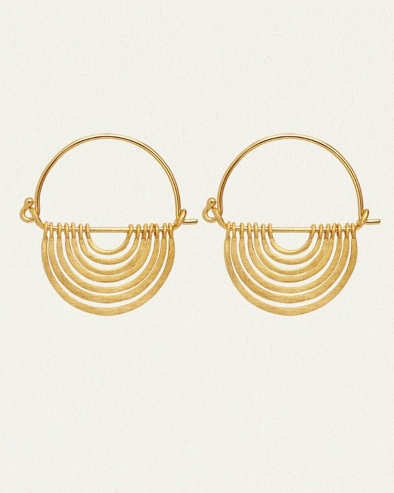 Hoop earrings were popular within the ancient Greek culture, dating back to the 5th century BC. The Baye Earrings, in cross-brushed 18k Gold Vermeil, have seven hand-shaped semi-circles that hang symmetrically and ripple in harmony as they move. The number seven has a very particular symbolic meaning; in many cultures it's considered beneficial and protective. The seven is the Seeker, the Thinker and the Searcher of Truth.