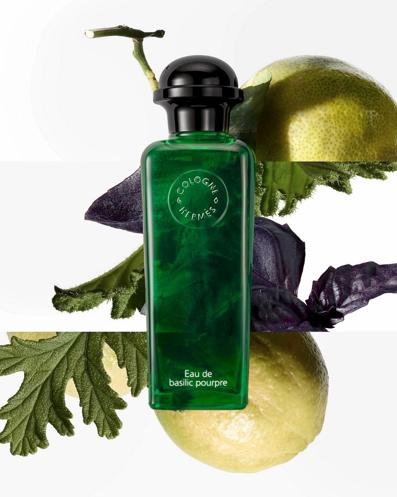 Conceived by Hermes perfumer Christine Nagel, Eau de basilic pourpre is a tribute to purple basil, a sun-drenched aromatic that calls to mind conviviality and summer holidays with the family.