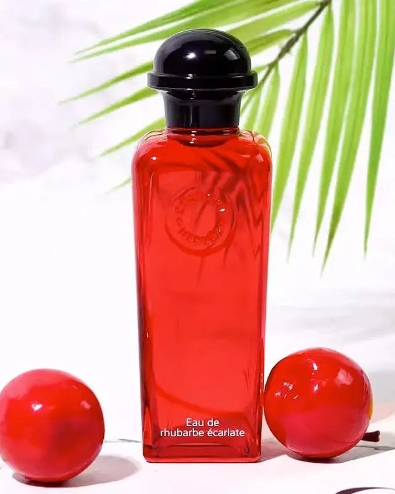 Hermès perfumer Christine Nagel created Eau de rhubarbe ecarlate in 2016. An unexpected interpretation of the Hermès Cologne, it revisits the surprising freshness of a herbaceous plant: rhubarb.