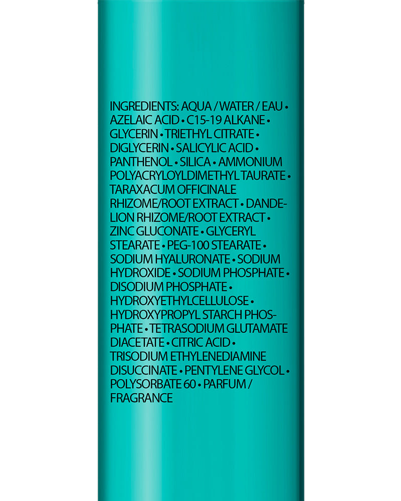 2039154 34 - INGREDIENTS : AQUA / WATER / EAU • AZELAIC ACID • C15-19 ALKANE • GLYCERIN • TRIETHYL CITRATE • DIGLYCERIN • SALICYLIC ACID • PANTHENOL • SILICA • AMMONIUM POLYACRYLOYLDIMETHYL TAURATE • TARAXACUM OFFICINALE RHIZOME/ROOT EXTRACT - DANDELION RHIZOME/ROOT EXTRACT • ZINC GLUCONATE • GLYCERYL STEARATE • PEG-100 STEARATE • SODIUM HYALURONATE • SODIUM HYDROXIDE • SODIUM PHOSPHATE • DISODIUM PHOSPHATE • HYDROXYETHYLCELLULOSE • HYDROXYPROPYL STARCH PHOSPHATE • TETRASODIUM GLUTAMATE DIACETATE • CITRIC ACID • TRISODIUM ETHYLENEDIAMINE DISUCCINATE • PENTYLENE GLYCOL • POLYSORBATE 60 • PARFUM / FRAGRANCE. (CODE F.I.L. : N70048676/1)