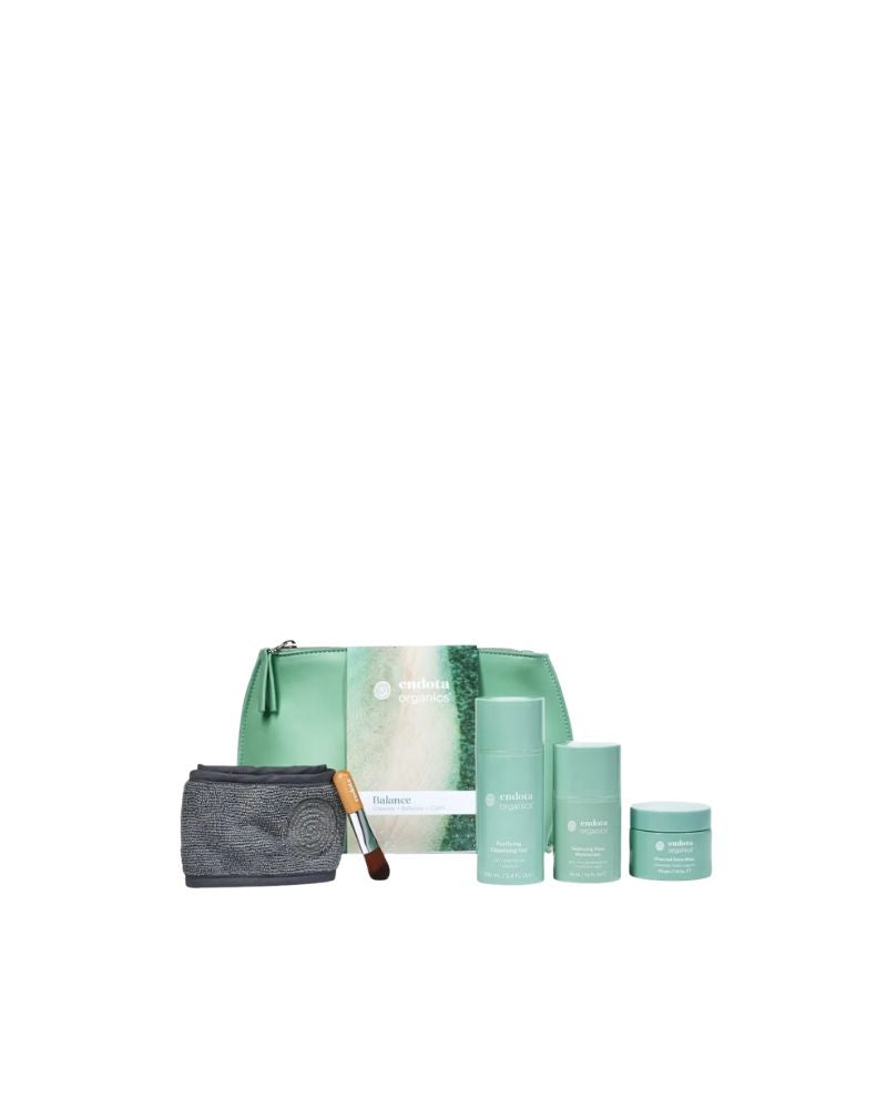 Open the sustainably-made pouch and you’ll find our Organics Purifying Cleansing Gel, Balancing Face Moisturiser and Charcoal Detox Mask. Each has been clinically-formulated to help mattify and revitalise oily to combination skin – both in your daily ritual and for moments of self-care. This kit comes with an endota spa headband and mask brush too – so you can really indulge in the full experience while freshening up your complexion.