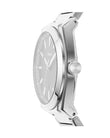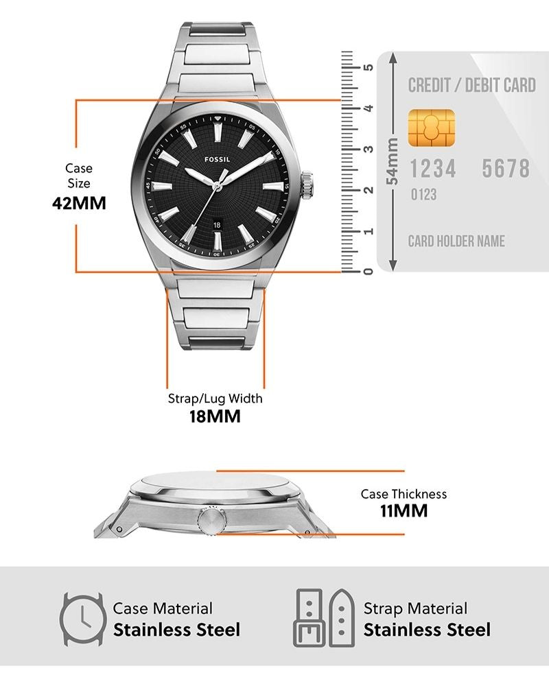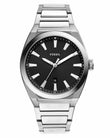 This 42mm Everett features a black sunray and textured dial, three-hand date movement and stainless steel bracelet.