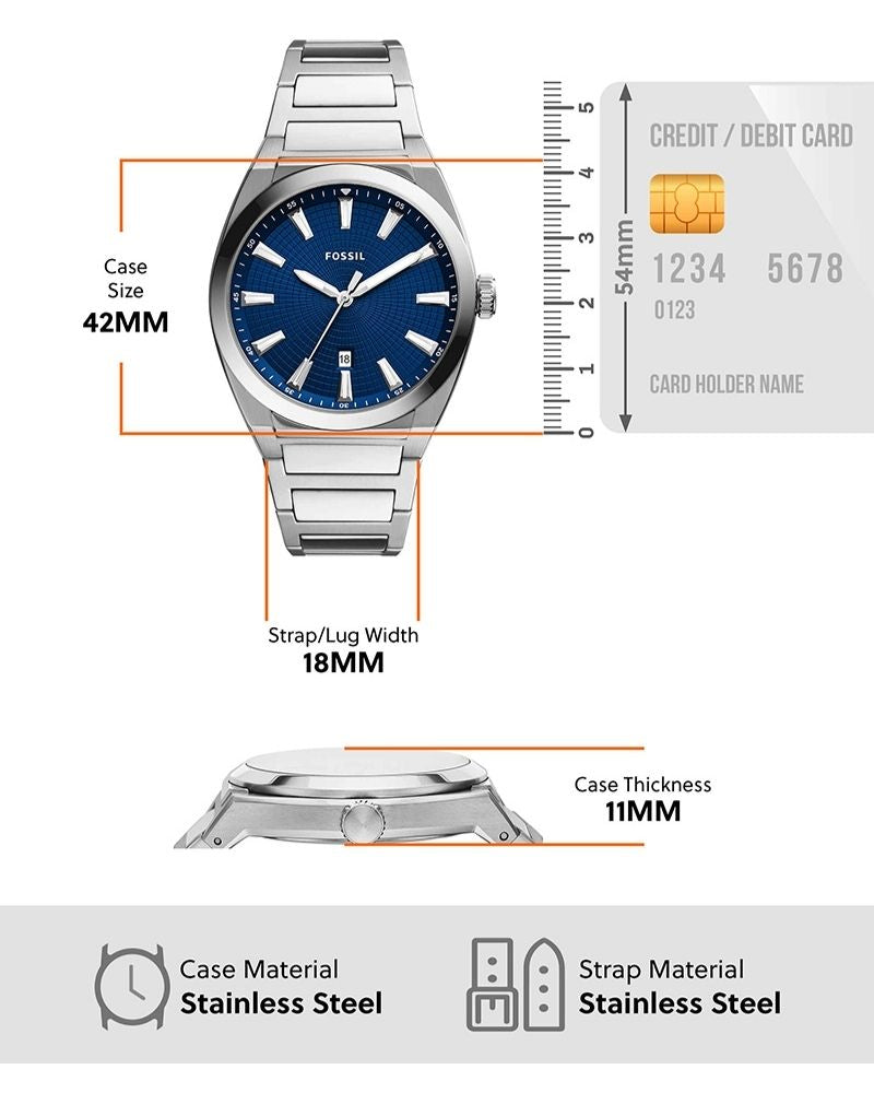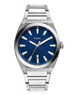 This 42mm Everett features a blue sunray and textured dial, three-hand date movement and stainless steel bracelet.