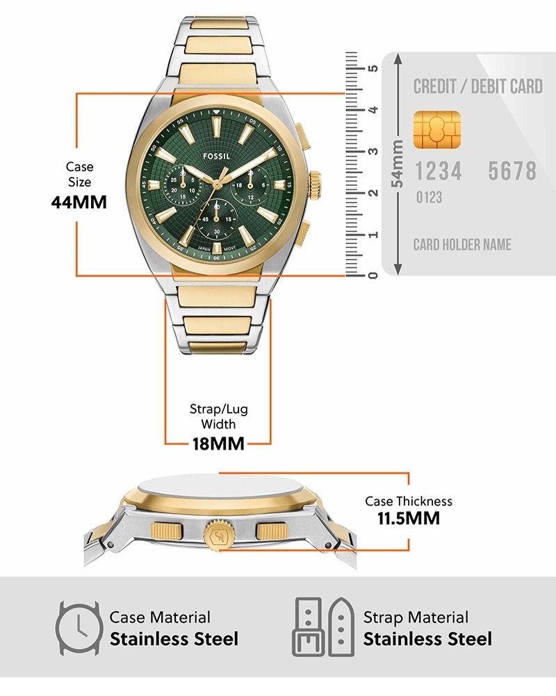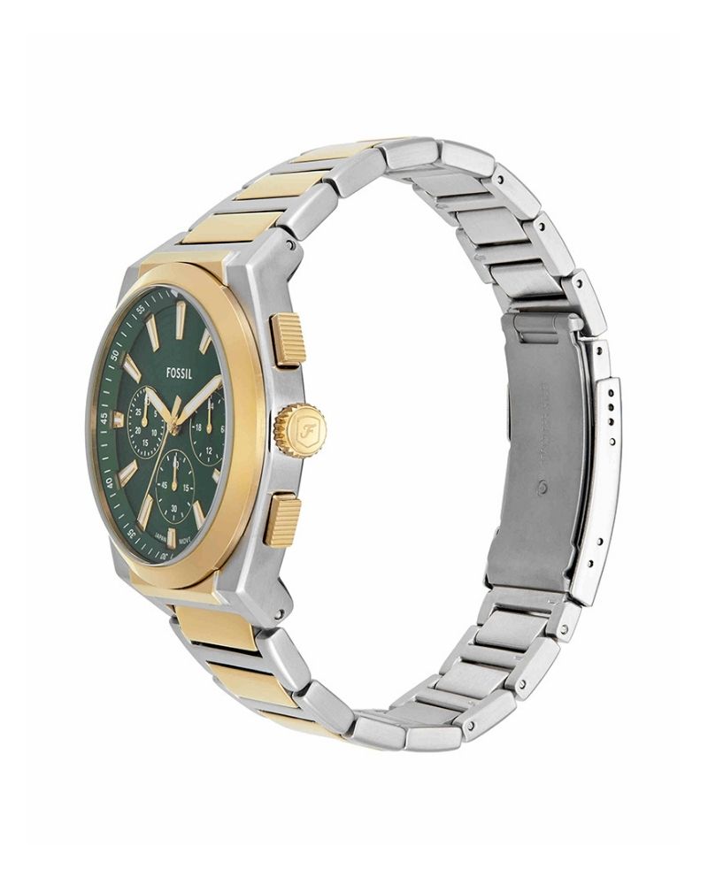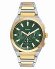 Exuding effortless style, the Everett Chronograph. This sporty watch balances casual cool with refined sophistication. The sunray green dial, encased in a 44mm round two-tone stainless steel case, lends a touch of modern inspiration. Functional details like Japanese chronograph quartz movement and a solid steel bracelet ensure this versatile timepiece keeps you on schedule. Slip on this iconic accessory and take on whatever comes your way.