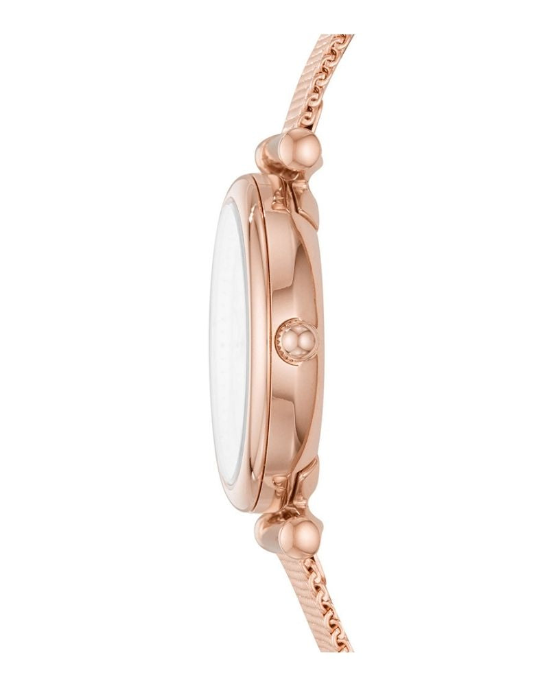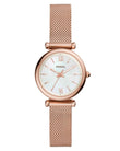 This 28mm Carlie features a mother-of-pearl dial with Roman numerals, three-hand movement and stainless steel rose gold-tone mesh bracelet.