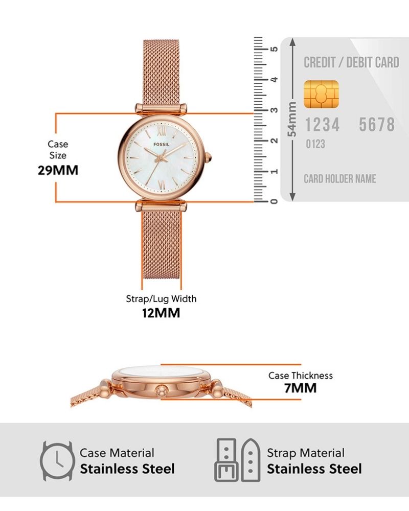• Rose gold plated stainless steel bracelet with safety mesh buckle closure; interchangeable with Fossil 12mm watch straps