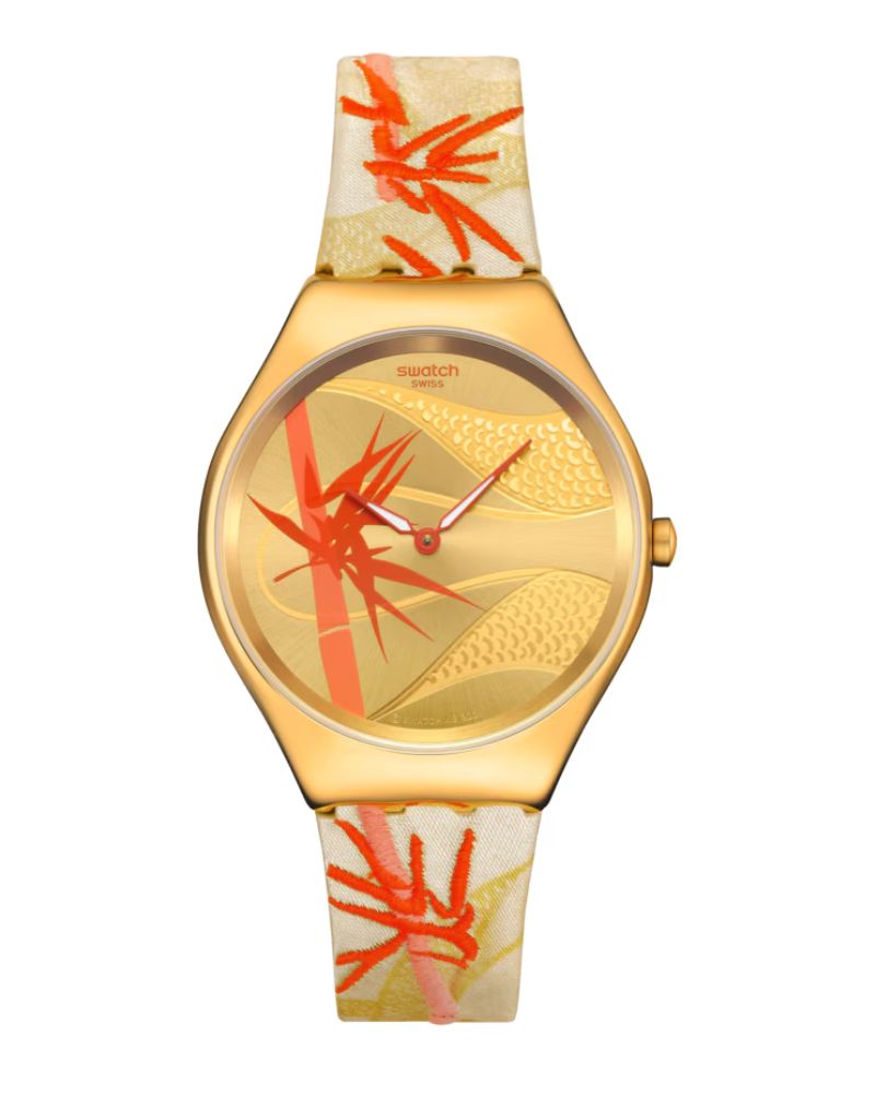 Swatch Golden Red Bamboo 38Mm Quartz Gold Dial Beige Leather Strap Syxz105