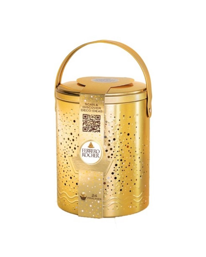 The Ferrero Rocher Iconic gift tin is a premium gift from the world's most beloved praline brand. A gift that can be reused as a decorative item with a premium look, engraved and embossed elements, and a handle that makes it easy to carry.
