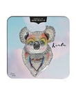 Animals of Australia - Koala. A Square tin with drawing of a Koala. Artwork by Zinia King. Comes with 150 grams of Lemon Myrtle flavoured Butter Finger biscuits.