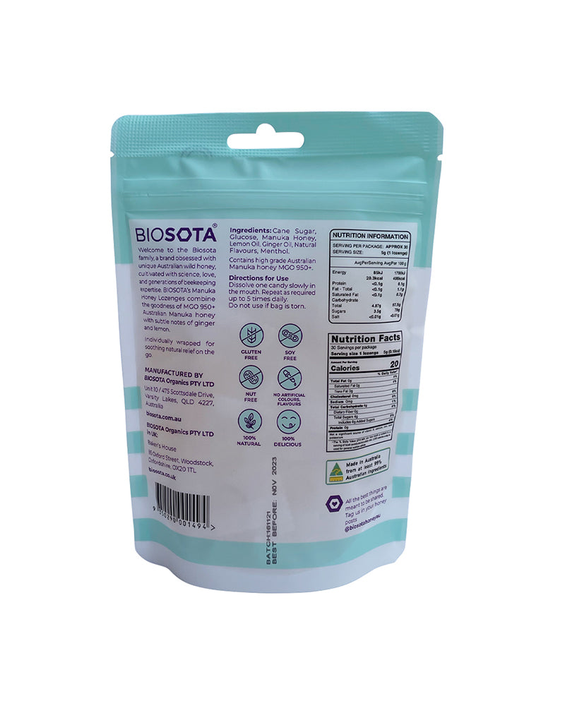 Ingredients: Cane sugar, Glucose, Australian Manuka honey MGO 950+, Lemon oil, Ginger oil, Natural flavours, Menthol.