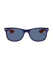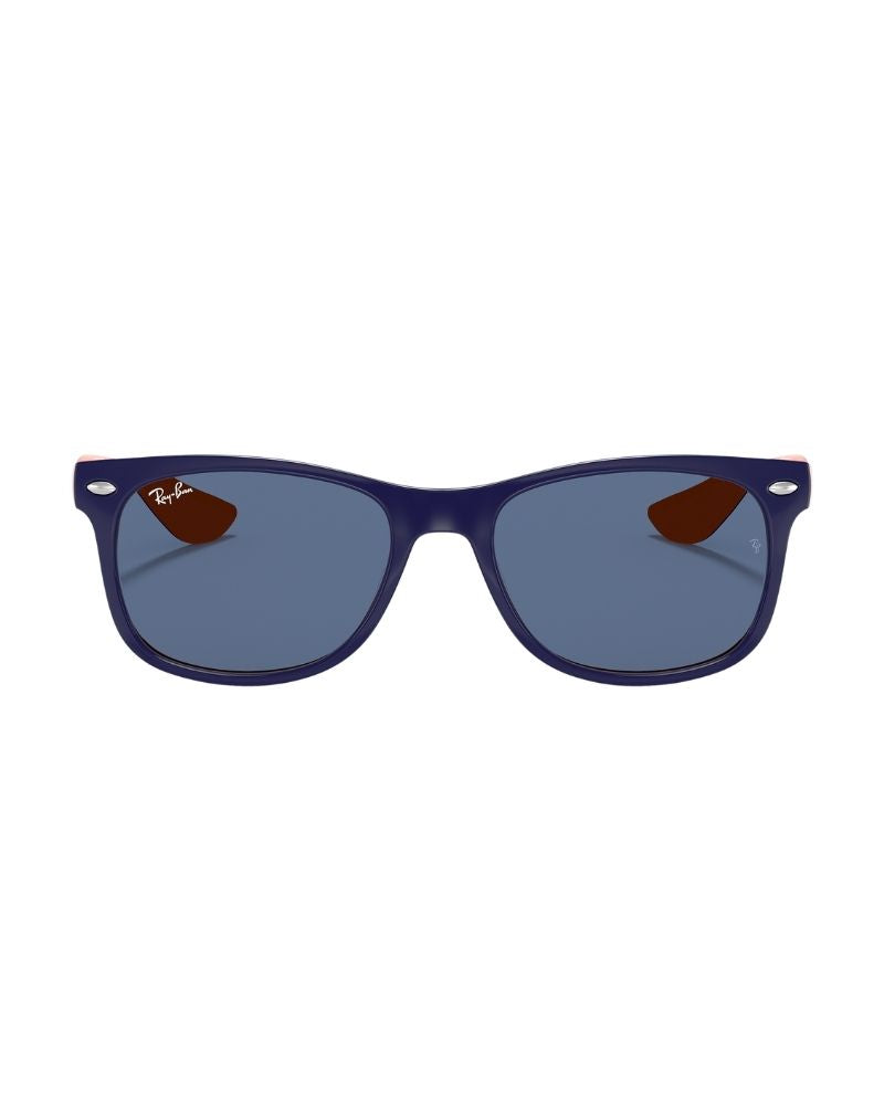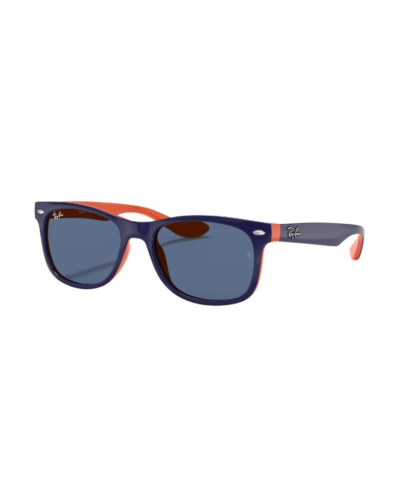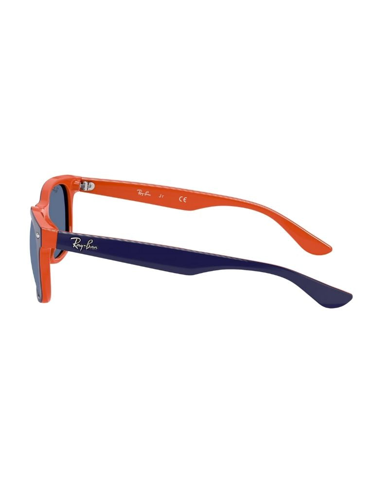 Introducing the Ray-Ban New Wayfarer Kids sunglasses, designed for children. These sunglasses feature a square lens shape and blue lenses on orange frames. The smaller size of these shades makes them perfect for younger wearers. With their polished finish in blue on orange, they're ready to make an impression at the beach or the playground.