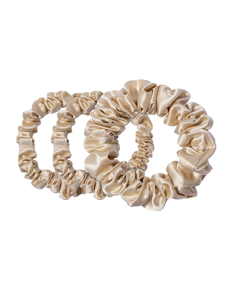 2 x blonde pure silk midi scrunchies, 1 x blonde pure silk large scrunchie