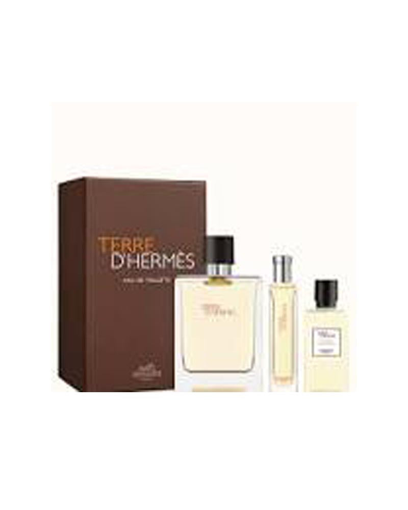 The Terre d’Hermes gift set comprises one 15 ml eau de toilette spray, one 40 ml after-shave lotion, one 40 ml hair and body shower gel and a 50 g scented soap.