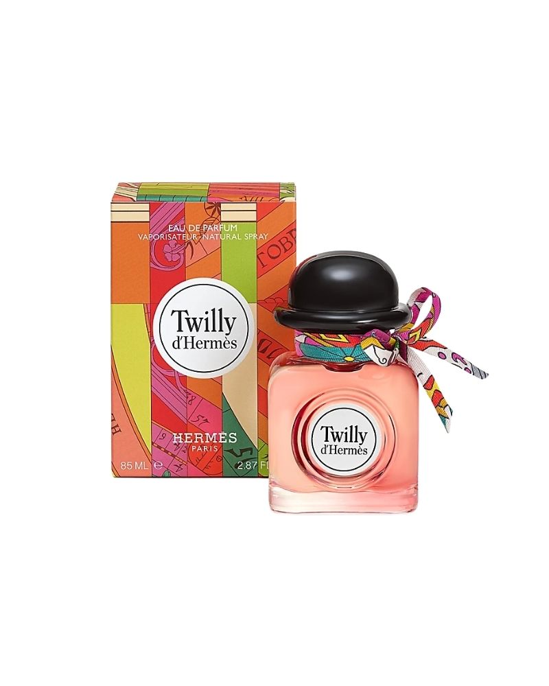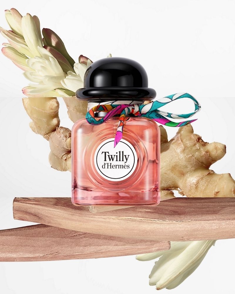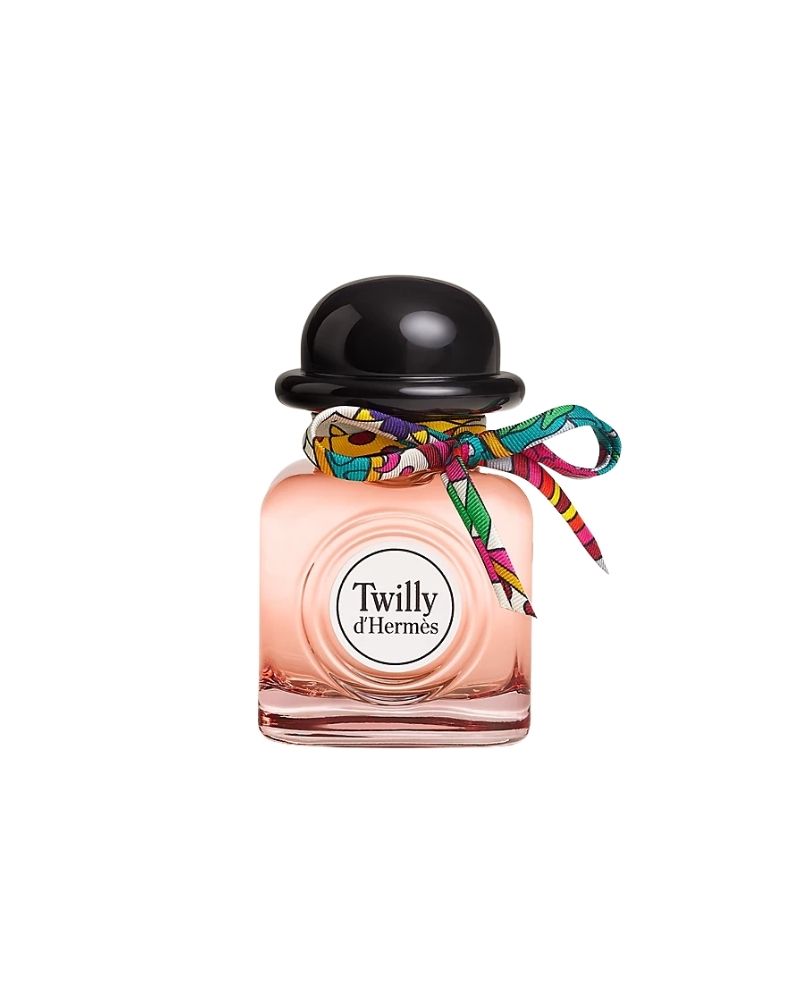 The Twilly d'Hermès family of perfumes evokes the Hermès silk métier on two fronts: it calls to mind the House's silk twill scarf as well as the Twilly, a small, joyful, colorful silk ribbon that can be worn in countless ways.